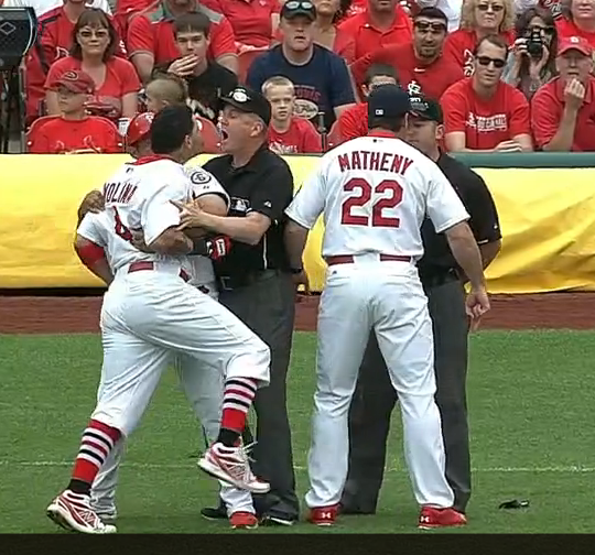 HIS 3000 POUND BROTHER THEN TRIES TO HOLD HIM BACK AS MIKE MATHENY ALSO GOES BIZONKERS AT THE UMPIRE.